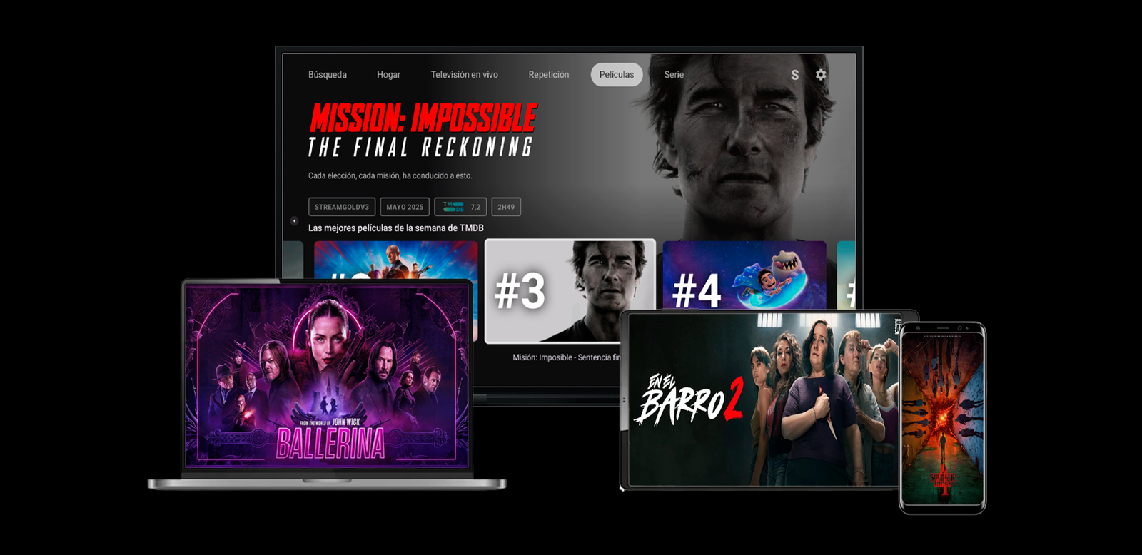 Stream Gold ofrece acceso a una amplia variedad de películas, series, canales de TV en vivo y fútbol, todo desde una sola plataforma.