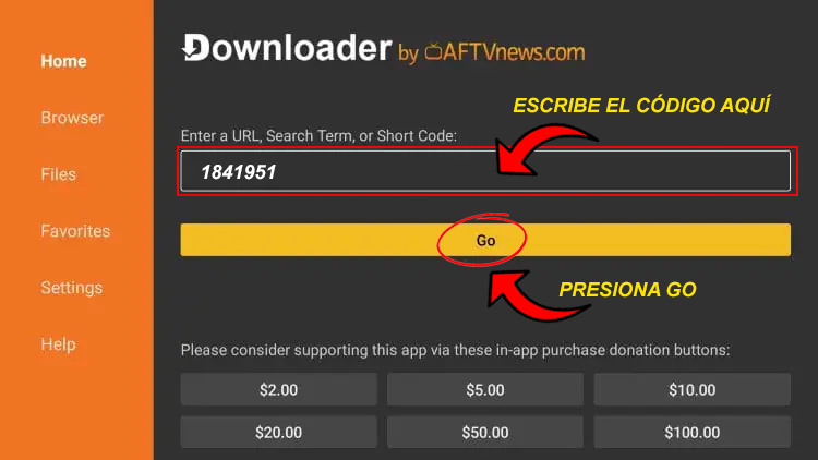 Abre la aplicación Downloader y en la barra principal escribe uno de estos: