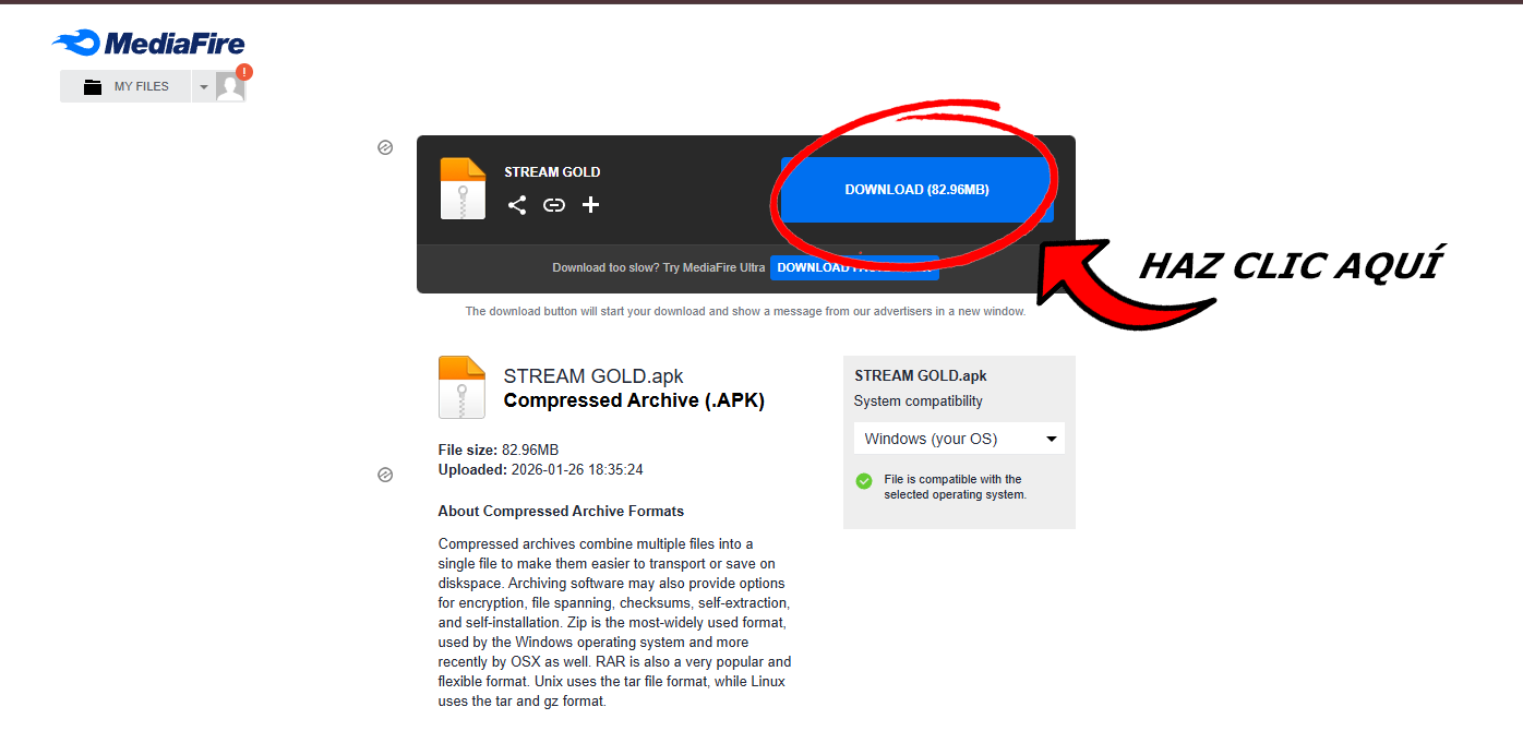 📥 Luego de presionar el botón AZUL, la aplicación comenzará a descargarse automáticamente.